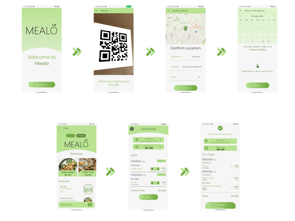 Through MEALO users can order food to their accommodation in a simple and fast way. The user can download the mobile application and scan the available QR code in their accommodation. MEALO gives them the capability to schedule delivery date and time, securing a healthy diet during their vacations.